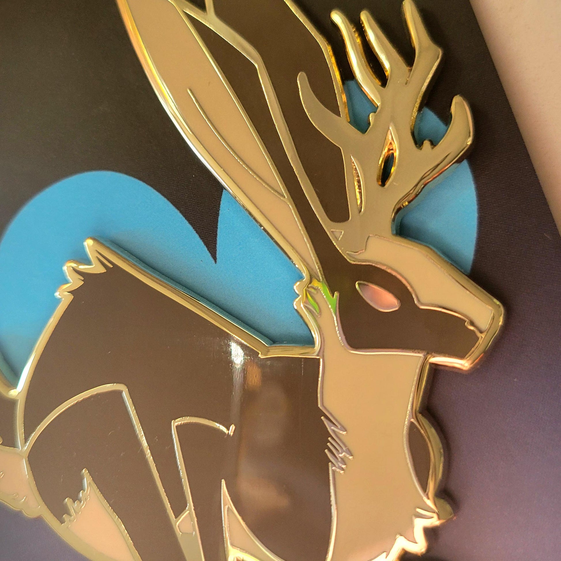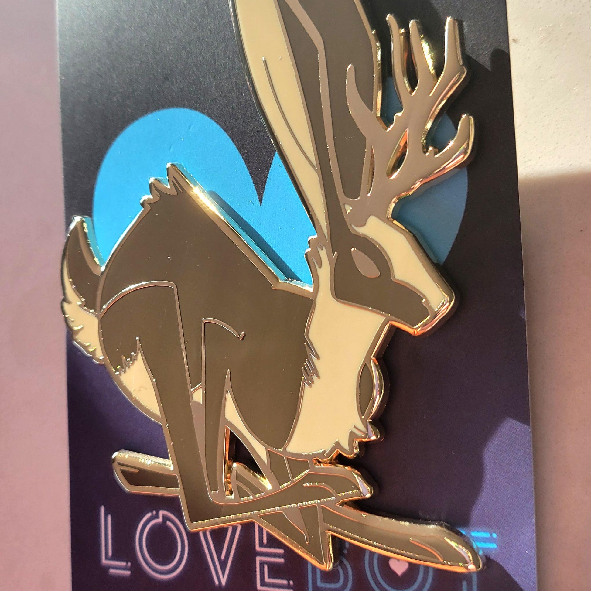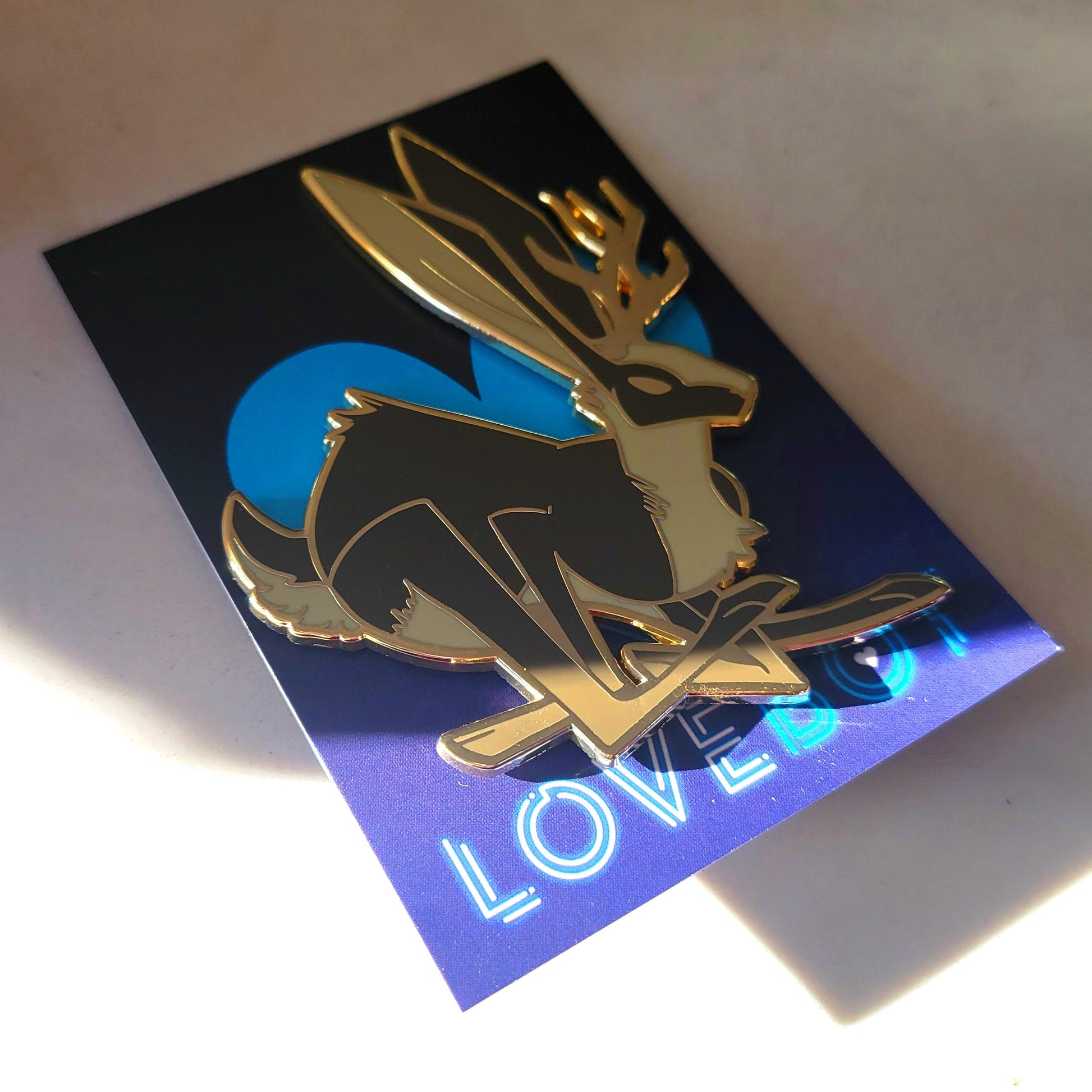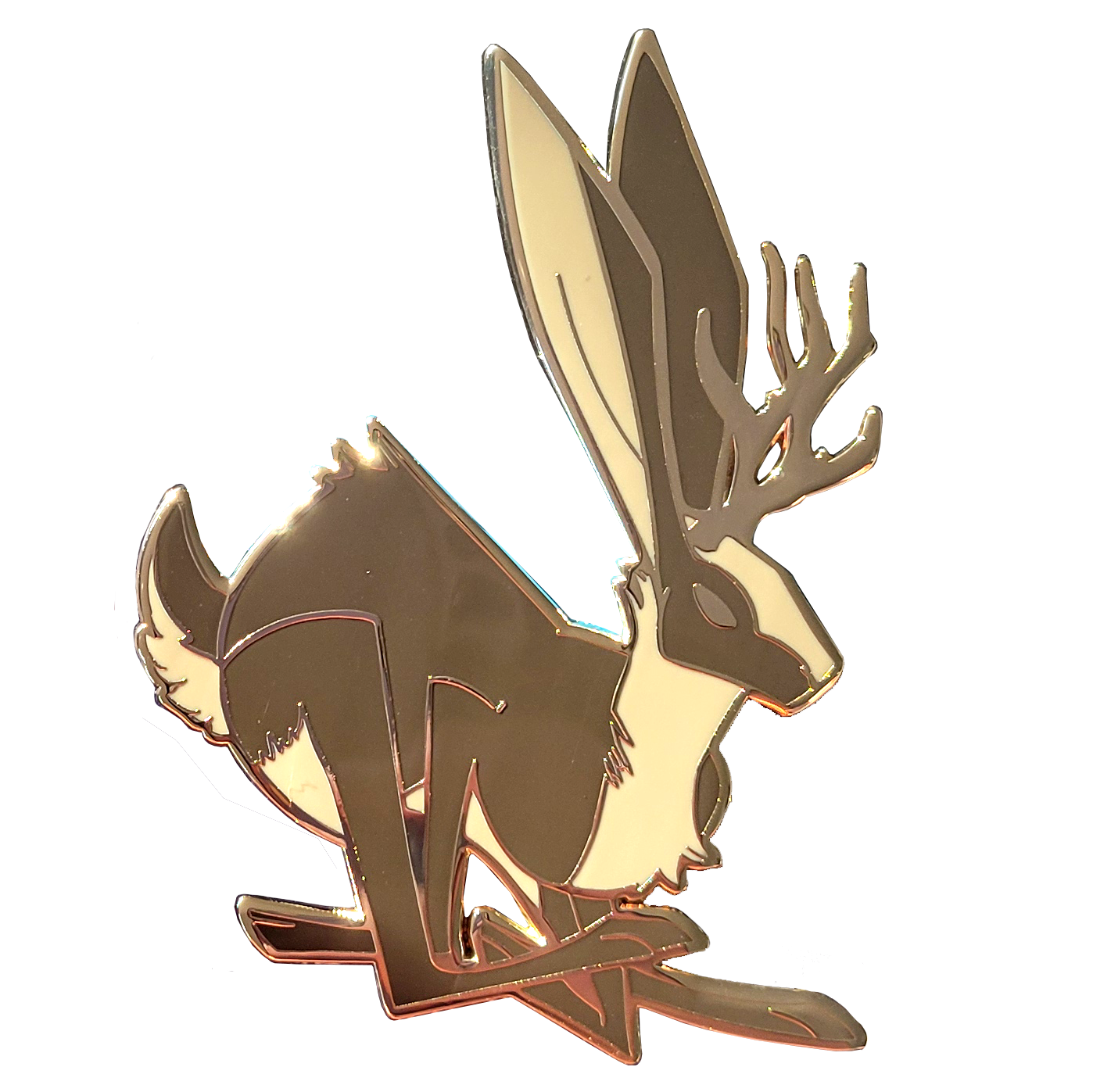 Gold Plated Hard Enamel Pin of the Jackalope on the back of Xada's Jacket!