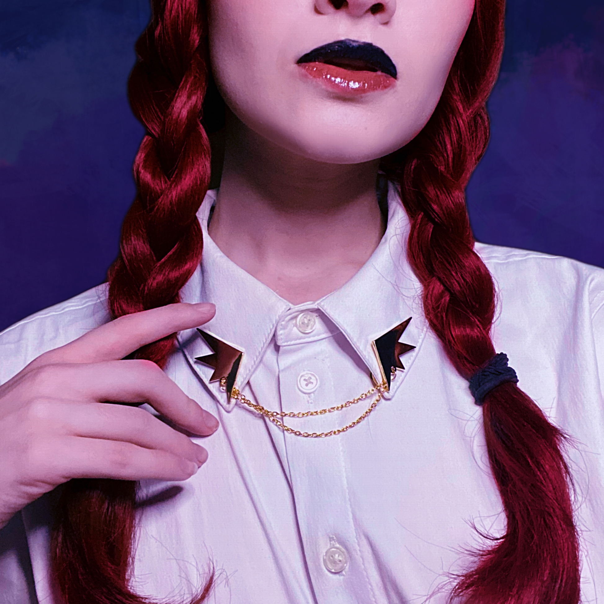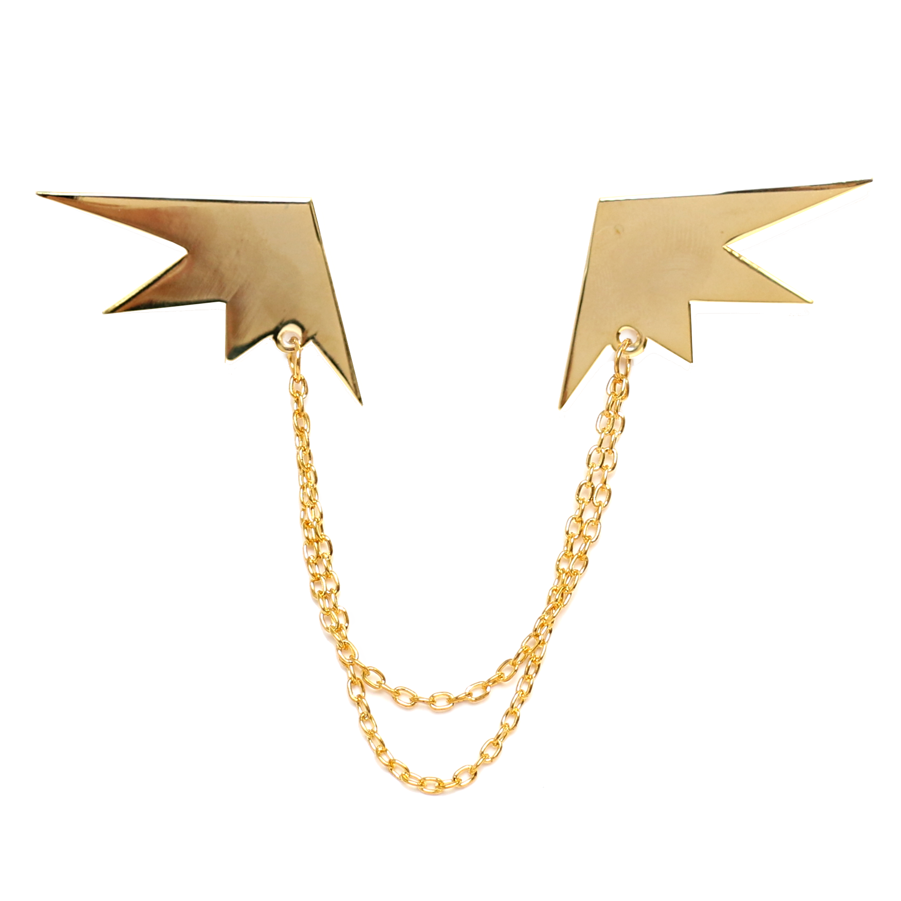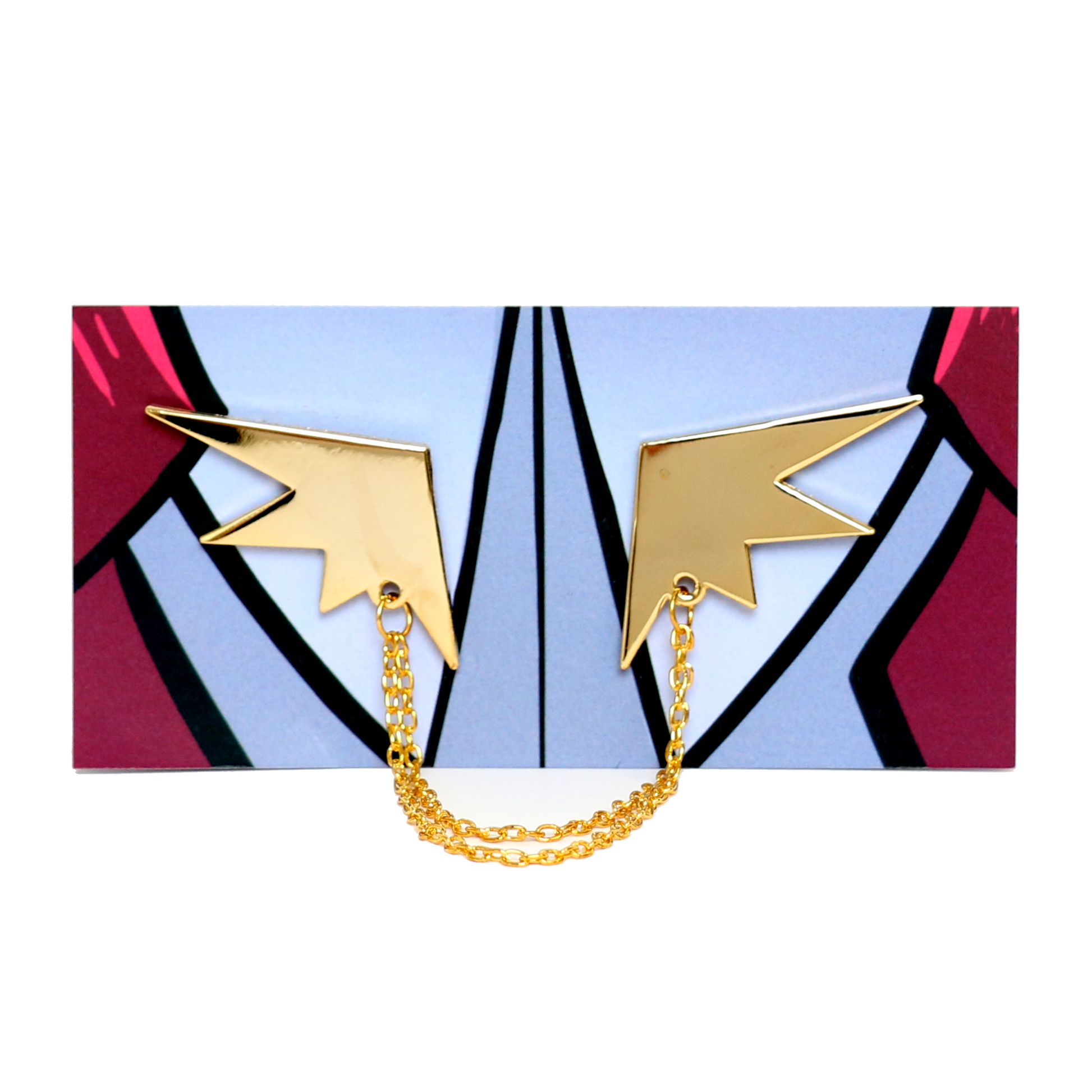 Two hard enamel wing pins with gold plating connected with a gold chain to match Camille! Perfect for cosplay and (business) casual wear!
